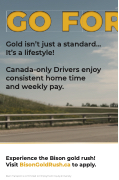 Gold isn’t just a standard... It’s a lifestyle! Canada-only Drivers enjoy consistent home time and weekly pay. Experience the Bison gold rush! Visit BisonGoldRush.ca to apply. Bison Transport is committed to Employment Equity & Diversity